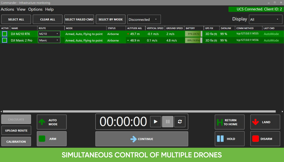 Drone connection to UgCS Commander works in the same way it does for normal UgCS: DJI drones are connected using an Android device running UgCS for DJI, other drones are connected either via radio datalinks or other means (Wi-Fi, etc.).