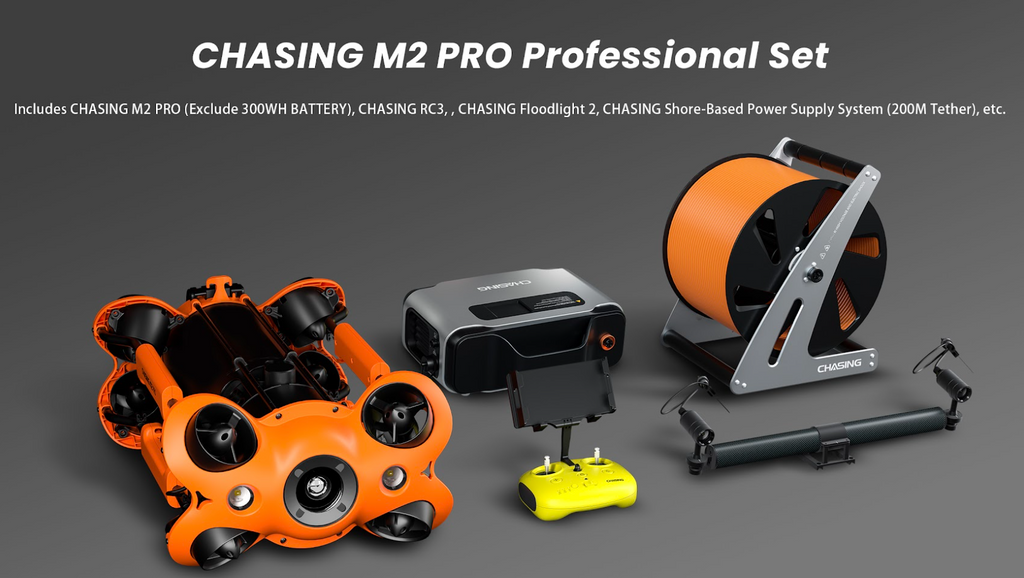CHASING M2 Pro Professional Set (200M) (300WH Battery not included) is a professional underwater ROV designed for professional users and industrial applications. M2 Pro has 8 Vectored Thrusters layout which allows OMNI movement in all directions. Compared to the CHASING M2, the M2 Pro motor has been upgraded by 50%. The Maximum speed is 4 Knots, the depth is 150 meters (490 FT) and the maximum horizontal radius is 400 meters (1300FT). M2 pro supports AC and battery hybrid power supply to achieve unlimited battery life. Not only compatible with sophisticated attachments such as Grabber Claw, Floodlight laser scaler, etc but also compatible with Control Console (High-brightness Screen), Docking station,
