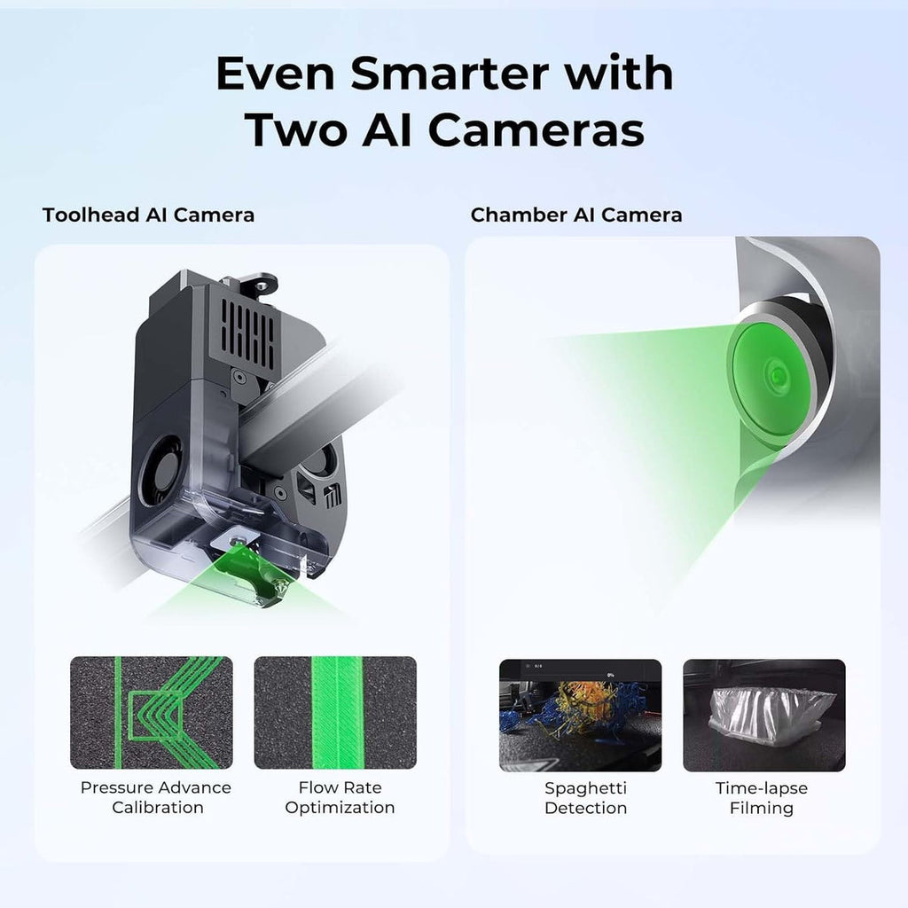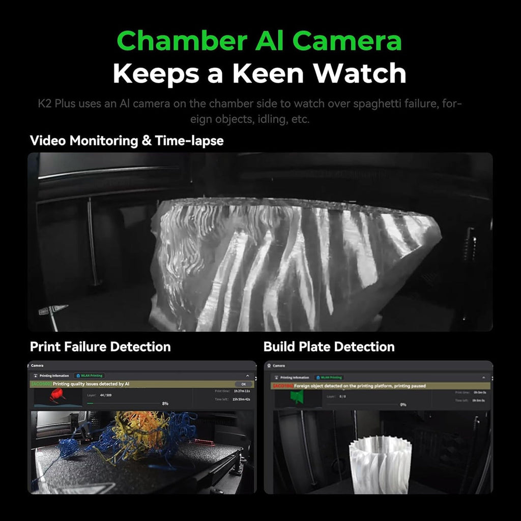 - DUAL AI CAMERAS & AUTOMATION: K2 Plus is equipped with 18 intelligent sensors. Everything is automated and closely monitored. It has two AI cameras. One is on the side of the chamber to monitor pasta faults, idling, and more. The other is on the tool head for optimizing the flow rate. No more underfeeding or overfeeding. This gives everyone an expert first layer