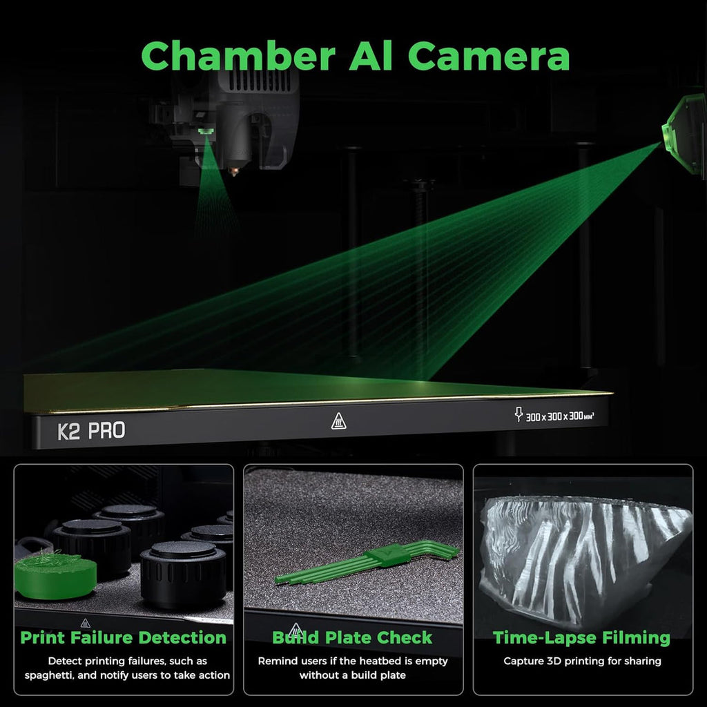 - Dual AI camera monitoring system: K2 Pro Combo uses AI camera indoors to observe pasta failures, foreign objects, idles, etc. It alerts you when an error occurs. It also supports real-time monitoring and time-lapse shooting. Nozzles Camera can be adjust nozzle flow rate in real-time, preventing under- or over-extrusion